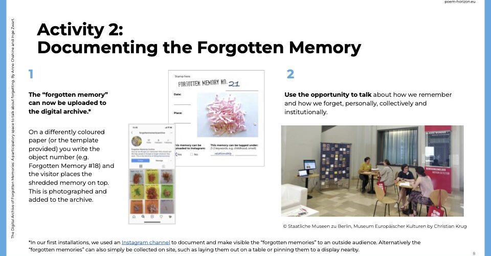 The Digital Archive of Forgotten Memories (DAFM) was originally initiated by my lovely POEM colleague Inge Zwart and me, to propose a new format to communicate central themes of the POEM research project. The DAFM is envisioned as a participatory space to talk about the process of forgetting, where we would ask the visitor to envision something to forget, and then physically destroy this item under our guidance. The installation generated interesting discussions about what it means to remember and forget on an individual, social and institutional level.