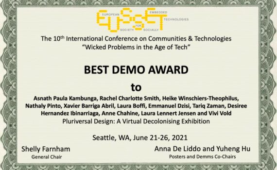 I am happy to announce that we received the Best Poster/Demo Award at the 10th International Conference on Communities & Technologies 2021 (Seattle and Online) for the presentation Pluriversal Design: A Virtual Decolonising Exhibition. As part of this collaboration, Laura Lennert Jensen, Vivi Vold and myself developed the exhibition space […]